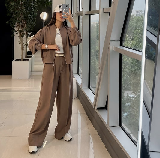 Long-sleeved Pleated Top and Two-piece Pants Suit