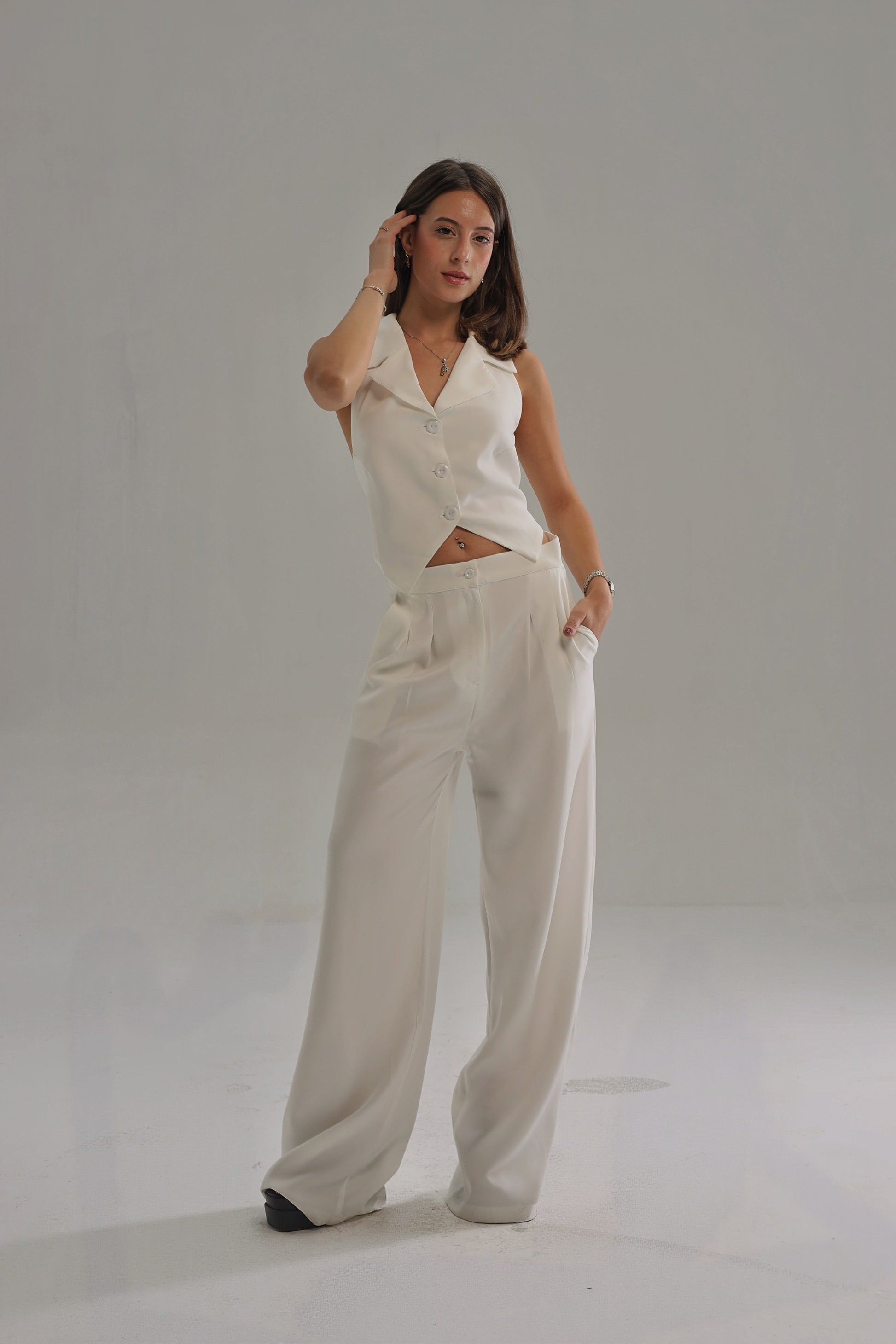- The Maverick Waistcoat suit a halter neck, vest top. The top features self covered fabric functional buttons, It has a cute open back detail